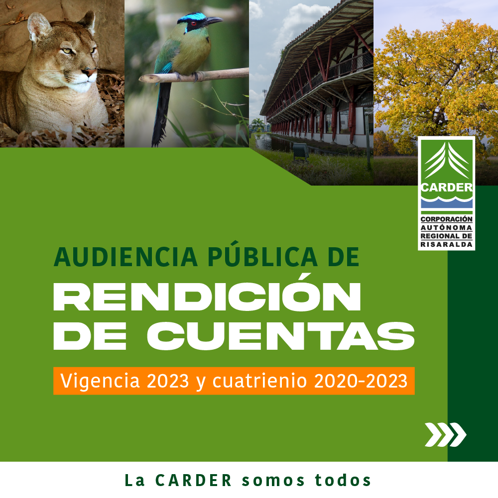 El Director General de la Corporación Autónoma Regional de Risaralda – CARDER, en cumplimiento de lo previsto en el artículo 2.2.8.6.4.11 del Decreto 1076 de 2015, invita a los representantes de los sectores públicos y privados, a las organizaciones no gubernamentales ambientales, a las comunidades indígenas y afrodescendientes, a los gremios económicos, las veedurías ciudadanas, los entes de control y a la ciudadanía en general, a la Audiencia Pública de Rendición de Cuentas de la Gestión adelantada por la CARDER en 2023 y el cuatrienio 2020-2023, con el fin de garantizar el control social de su gestión.