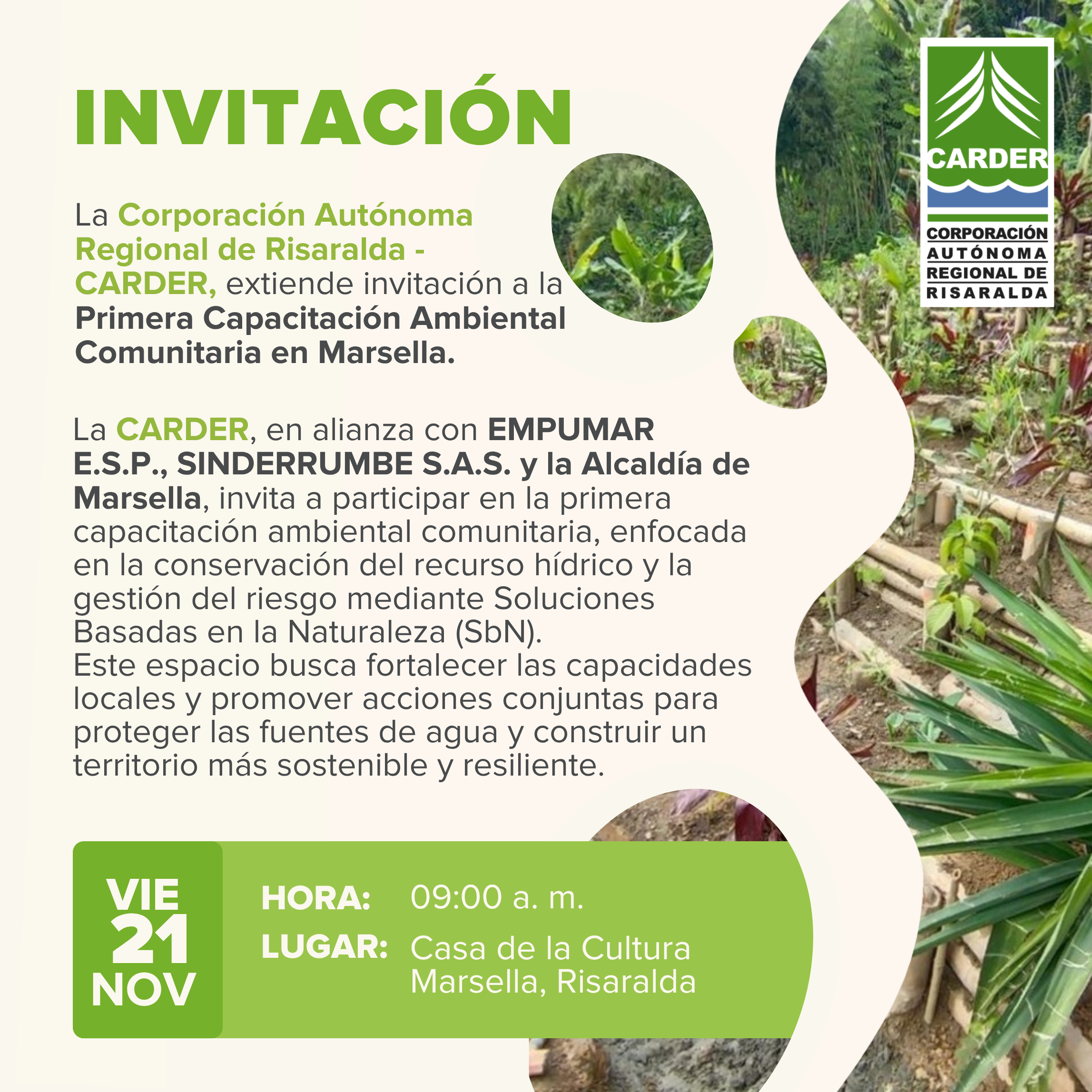 Buscar: Entradas recientes La CARDER recuerda uso exclusivo de canales oficiales para trámites y comunicaciones Los Negocios Verdes de la CARDER Brillan en BIOEXPO Nariño: “5 Mundos por Descubrir” Organizaciones comunitarias del SIDAP Risaralda presentan avances y acciones para la ejecución del POA en áreas de conservación La CARDER le da la bienvenida a la época decembrina y fomenta conciencia con el uso de la Pólvora La CARDER y autoridades de Dosquebradas frenan ocupación indebida y riesgos ambientales en predio rural del municipio Comentarios recientesDiagnóstico e identificación de problemas – CARDER en Arca AmbientalDiagnóstico e identificación de problemas – CARDER en CAMPAMENTO JUVENIL – ECOS AMBIENTALESControl social – CARDER en Informes de gestión del plan de acciónConsulta Ciudadana – CARDER en Programa de Transparencia y Ética Pública – PTEPPlaneación y presupuesto participativo – CARDER en Programa de Transparencia y Ética Pública – PTEP Fecha Nov 21 2025 ¡Caducado! Hora 9:00 am - 1:00 pm Capacitación Ambiental Comunitaria en Marsella Compartir este evento + Añadir Google Calendar + exportación iCal / Outlook