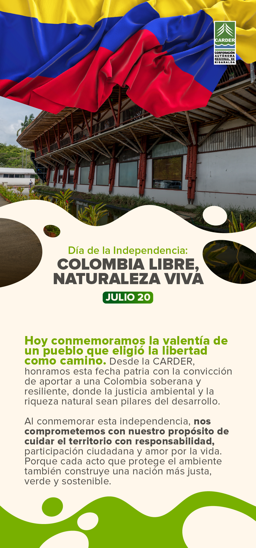 Buscar: Entradas recientes La CARDER recuerda uso exclusivo de canales oficiales para trámites y comunicaciones Los Negocios Verdes de la CARDER Brillan en BIOEXPO Nariño: “5 Mundos por Descubrir” Organizaciones comunitarias del SIDAP Risaralda presentan avances y acciones para la ejecución del POA en áreas de conservación La CARDER le da la bienvenida a la época decembrina y fomenta conciencia con el uso de la Pólvora La CARDER y autoridades de Dosquebradas frenan ocupación indebida y riesgos ambientales en predio rural del municipio Comentarios recientesDiagnóstico e identificación de problemas – CARDER en Arca AmbientalDiagnóstico e identificación de problemas – CARDER en CAMPAMENTO JUVENIL – ECOS AMBIENTALESControl social – CARDER en Informes de gestión del plan de acciónConsulta Ciudadana – CARDER en Programa de Transparencia y Ética Pública – PTEPPlaneación y presupuesto participativo – CARDER en Programa de Transparencia y Ética Pública – PTEP Fecha Jul 20 2025 ¡Caducado! Hora Todo el día Día de la Independencia de Colombia Compartir este evento + Añadir Google Calendar + exportación iCal / Outlook