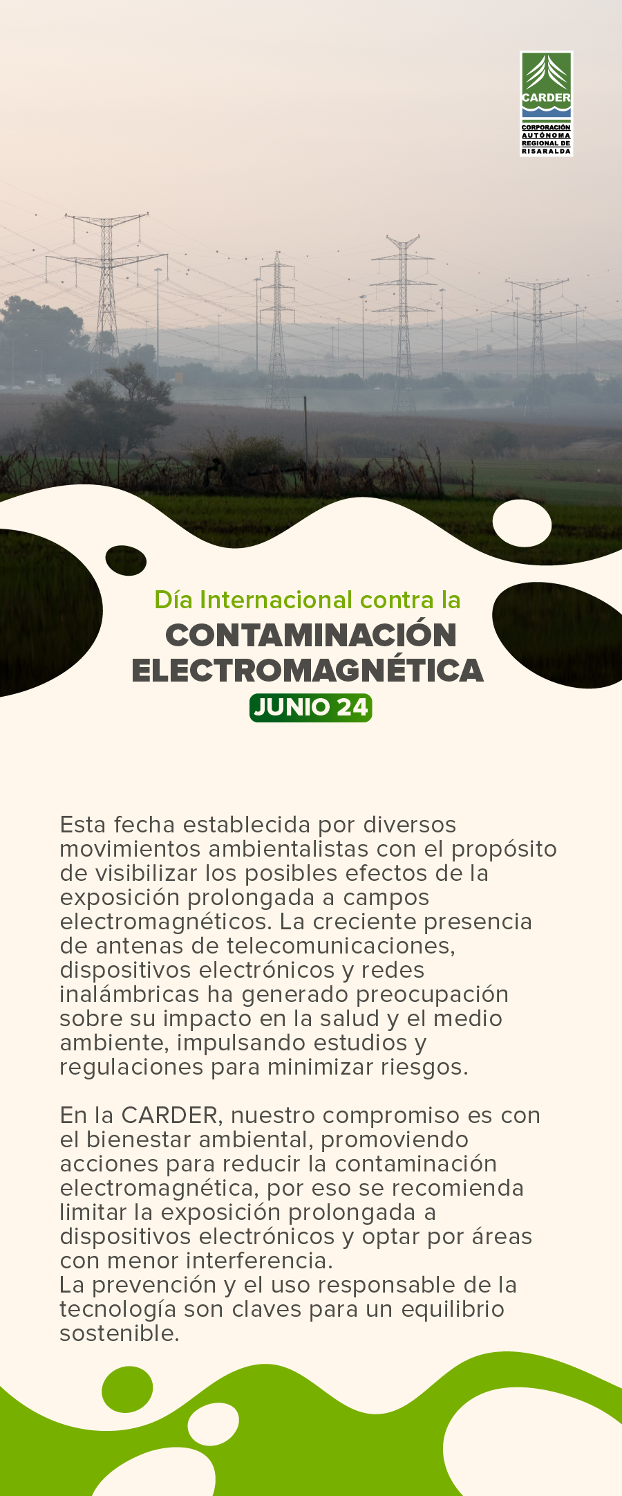 Buscar: Entradas recientes La CARDER recuerda uso exclusivo de canales oficiales para trámites y comunicaciones Los Negocios Verdes de la CARDER Brillan en BIOEXPO Nariño: “5 Mundos por Descubrir” Organizaciones comunitarias del SIDAP Risaralda presentan avances y acciones para la ejecución del POA en áreas de conservación La CARDER le da la bienvenida a la época decembrina y fomenta conciencia con el uso de la Pólvora La CARDER y autoridades de Dosquebradas frenan ocupación indebida y riesgos ambientales en predio rural del municipio Comentarios recientesDiagnóstico e identificación de problemas – CARDER en Arca AmbientalDiagnóstico e identificación de problemas – CARDER en CAMPAMENTO JUVENIL – ECOS AMBIENTALESControl social – CARDER en Informes de gestión del plan de acciónConsulta Ciudadana – CARDER en Programa de Transparencia y Ética Pública – PTEPPlaneación y presupuesto participativo – CARDER en Programa de Transparencia y Ética Pública – PTEP Fecha Jun 24 2025 ¡Caducado! Hora Todo el día Día de la lucha contra la contaminación electromagnética. Compartir este evento + Añadir Google Calendar + exportación iCal / Outlook