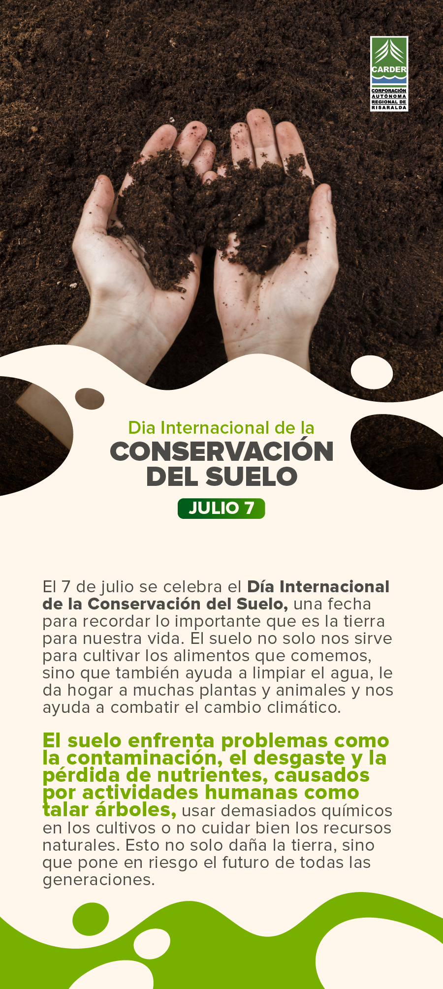 Buscar: Entradas recientes La CARDER recuerda uso exclusivo de canales oficiales para trámites y comunicaciones Los Negocios Verdes de la CARDER Brillan en BIOEXPO Nariño: “5 Mundos por Descubrir” Organizaciones comunitarias del SIDAP Risaralda presentan avances y acciones para la ejecución del POA en áreas de conservación La CARDER le da la bienvenida a la época decembrina y fomenta conciencia con el uso de la Pólvora La CARDER y autoridades de Dosquebradas frenan ocupación indebida y riesgos ambientales en predio rural del municipio Comentarios recientesDiagnóstico e identificación de problemas – CARDER en Arca AmbientalDiagnóstico e identificación de problemas – CARDER en CAMPAMENTO JUVENIL – ECOS AMBIENTALESControl social – CARDER en Informes de gestión del plan de acciónConsulta Ciudadana – CARDER en Programa de Transparencia y Ética Pública – PTEPPlaneación y presupuesto participativo – CARDER en Programa de Transparencia y Ética Pública – PTEP Fecha Jul 07 2025 ¡Caducado! Hora Todo el día Día Internacional de la Conservación del Suelo. Compartir este evento + Añadir Google Calendar + exportación iCal / Outlook