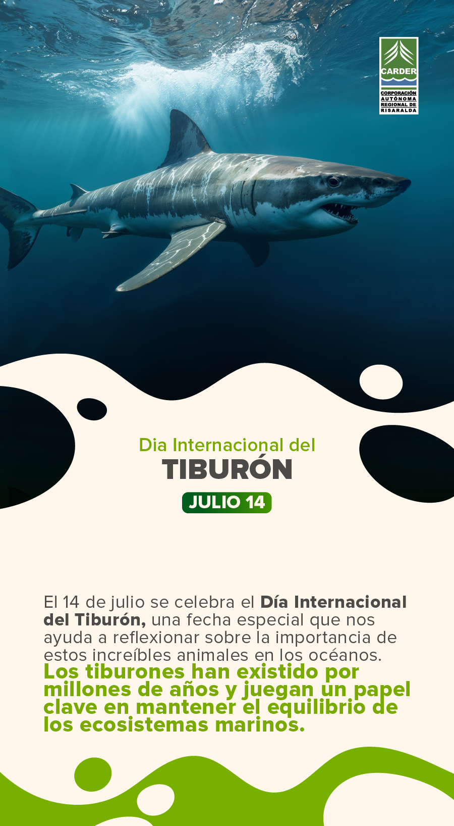 Buscar: Entradas recientes La CARDER recuerda uso exclusivo de canales oficiales para trámites y comunicaciones Los Negocios Verdes de la CARDER Brillan en BIOEXPO Nariño: “5 Mundos por Descubrir” Organizaciones comunitarias del SIDAP Risaralda presentan avances y acciones para la ejecución del POA en áreas de conservación La CARDER le da la bienvenida a la época decembrina y fomenta conciencia con el uso de la Pólvora La CARDER y autoridades de Dosquebradas frenan ocupación indebida y riesgos ambientales en predio rural del municipio Comentarios recientesDiagnóstico e identificación de problemas – CARDER en Arca AmbientalDiagnóstico e identificación de problemas – CARDER en CAMPAMENTO JUVENIL – ECOS AMBIENTALESControl social – CARDER en Informes de gestión del plan de acciónConsulta Ciudadana – CARDER en Programa de Transparencia y Ética Pública – PTEPPlaneación y presupuesto participativo – CARDER en Programa de Transparencia y Ética Pública – PTEP Fecha Jul 14 2025 ¡Caducado! Hora Todo el día Día Internacional del Tiburón. Compartir este evento + Añadir Google Calendar + exportación iCal / Outlook