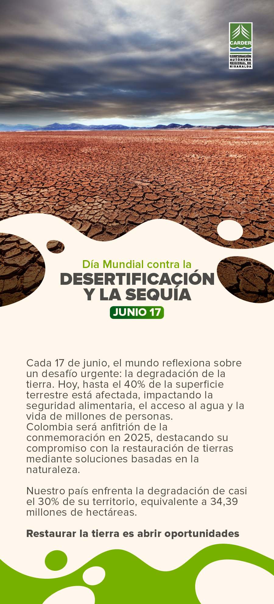 Buscar: Entradas recientes La CARDER recuerda uso exclusivo de canales oficiales para trámites y comunicaciones Los Negocios Verdes de la CARDER Brillan en BIOEXPO Nariño: “5 Mundos por Descubrir” Organizaciones comunitarias del SIDAP Risaralda presentan avances y acciones para la ejecución del POA en áreas de conservación La CARDER le da la bienvenida a la época decembrina y fomenta conciencia con el uso de la Pólvora La CARDER y autoridades de Dosquebradas frenan ocupación indebida y riesgos ambientales en predio rural del municipio Comentarios recientesDiagnóstico e identificación de problemas – CARDER en Arca AmbientalDiagnóstico e identificación de problemas – CARDER en CAMPAMENTO JUVENIL – ECOS AMBIENTALESControl social – CARDER en Informes de gestión del plan de acciónConsulta Ciudadana – CARDER en Programa de Transparencia y Ética Pública – PTEPPlaneación y presupuesto participativo – CARDER en Programa de Transparencia y Ética Pública – PTEP Fecha Jun 17 2025 ¡Caducado! Hora Todo el día Día Mundial contra la Desertificación y la Sequía Compartir este evento + Añadir Google Calendar + exportación iCal / Outlook