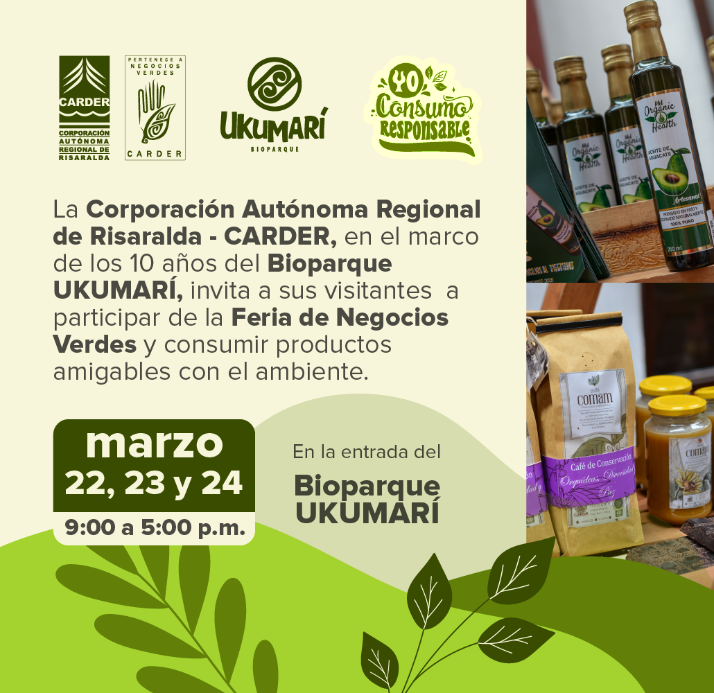 Buscar: Entradas recientes La CARDER recuerda uso exclusivo de canales oficiales para trámites y comunicaciones Los Negocios Verdes de la CARDER Brillan en BIOEXPO Nariño: “5 Mundos por Descubrir” Organizaciones comunitarias del SIDAP Risaralda presentan avances y acciones para la ejecución del POA en áreas de conservación La CARDER le da la bienvenida a la época decembrina y fomenta conciencia con el uso de la Pólvora La CARDER y autoridades de Dosquebradas frenan ocupación indebida y riesgos ambientales en predio rural del municipio Comentarios recientesDiagnóstico e identificación de problemas – CARDER en Arca AmbientalDiagnóstico e identificación de problemas – CARDER en CAMPAMENTO JUVENIL – ECOS AMBIENTALESControl social – CARDER en Informes de gestión del plan de acciónConsulta Ciudadana – CARDER en Programa de Transparencia y Ética Pública – PTEPPlaneación y presupuesto participativo – CARDER en Programa de Transparencia y Ética Pública – PTEP Fecha Mar 22 2025 ¡Caducado! Hora 9:00 am - 5:00 pm Feria de Negocios Verdes Compartir este evento + Añadir Google Calendar + exportación iCal / Outlook