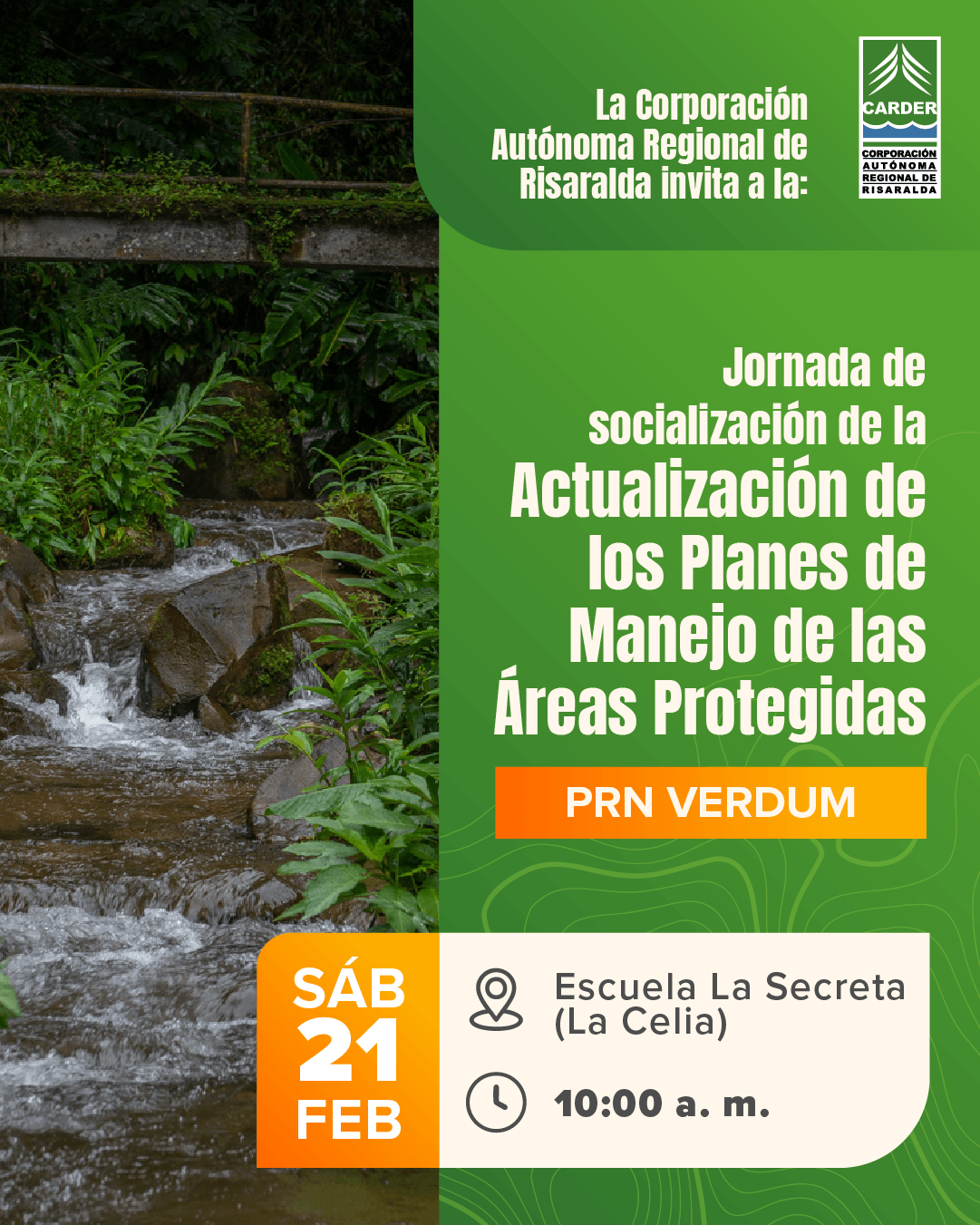 Buscar: Entradas recientes La CARDER realizó 734 liberaciones de fauna en la vigencia 2025 Nueva suspensión a la intervención de los recursos naturales por rellenar terrenos de forma improvisada La CARDER suspendió intervención ilegal en la vereda Filo Bonito, Dosquebradas CARDER y Masbosques capacitan a organismos de socorro para el control del caracol gigante africano CARDER y Sociedad de Mejoras de Pereira proyectan sendero temático para recrear las áreas protegidas de Risaralda Comentarios recientesDiagnóstico e identificación de problemas – CARDER en Arca AmbientalDiagnóstico e identificación de problemas – CARDER en CAMPAMENTO JUVENIL – ECOS AMBIENTALESControl social – CARDER en Informes de gestión del plan de acciónConsulta Ciudadana – CARDER en Programa de Transparencia y Ética Pública – PTEPPlaneación y presupuesto participativo – CARDER en Programa de Transparencia y Ética Pública – PTEP Fecha Feb 21 2026 Hora 10:00 am - 12:00 pm Jornada de socialización de la Actualización Planes de Manejo Áreas Protegidas de Risaralda – La Celia Compartir este evento + Añadir Google Calendar + exportación iCal / Outlook