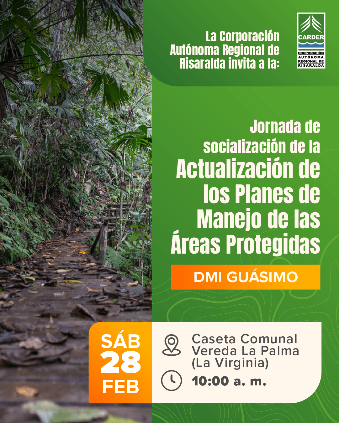 Buscar: Entradas recientes La CARDER realizó 734 liberaciones de fauna en la vigencia 2025 Nueva suspensión a la intervención de los recursos naturales por rellenar terrenos de forma improvisada La CARDER suspendió intervención ilegal en la vereda Filo Bonito, Dosquebradas CARDER y Masbosques capacitan a organismos de socorro para el control del caracol gigante africano CARDER y Sociedad de Mejoras de Pereira proyectan sendero temático para recrear las áreas protegidas de Risaralda Comentarios recientesDiagnóstico e identificación de problemas – CARDER en Arca AmbientalDiagnóstico e identificación de problemas – CARDER en CAMPAMENTO JUVENIL – ECOS AMBIENTALESControl social – CARDER en Informes de gestión del plan de acciónConsulta Ciudadana – CARDER en Programa de Transparencia y Ética Pública – PTEPPlaneación y presupuesto participativo – CARDER en Programa de Transparencia y Ética Pública – PTEP Fecha Feb 28 2026 Hora 10:00 am - 12:00 pm Jornada de socialización de la Actualización Planes de Manejo Áreas Protegidas de Risaralda – La Virginia Compartir este evento + Añadir Google Calendar + exportación iCal / Outlook