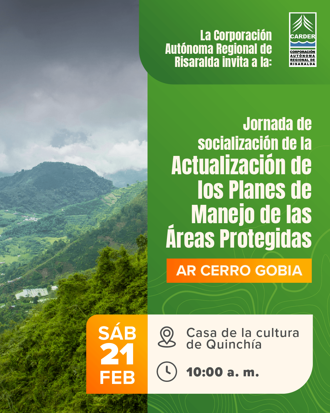Buscar: Entradas recientes La CARDER realizó 734 liberaciones de fauna en la vigencia 2025 Nueva suspensión a la intervención de los recursos naturales por rellenar terrenos de forma improvisada La CARDER suspendió intervención ilegal en la vereda Filo Bonito, Dosquebradas CARDER y Masbosques capacitan a organismos de socorro para el control del caracol gigante africano CARDER y Sociedad de Mejoras de Pereira proyectan sendero temático para recrear las áreas protegidas de Risaralda Comentarios recientesDiagnóstico e identificación de problemas – CARDER en Arca AmbientalDiagnóstico e identificación de problemas – CARDER en CAMPAMENTO JUVENIL – ECOS AMBIENTALESControl social – CARDER en Informes de gestión del plan de acciónConsulta Ciudadana – CARDER en Programa de Transparencia y Ética Pública – PTEPPlaneación y presupuesto participativo – CARDER en Programa de Transparencia y Ética Pública – PTEP Fecha Feb 21 2026 Hora 10:00 am - 12:00 pm Jornada de socialización de la Actualización Planes de Manejo Áreas Protegidas de Risaralda – Quinchía Compartir este evento + Añadir Google Calendar + exportación iCal / Outlook