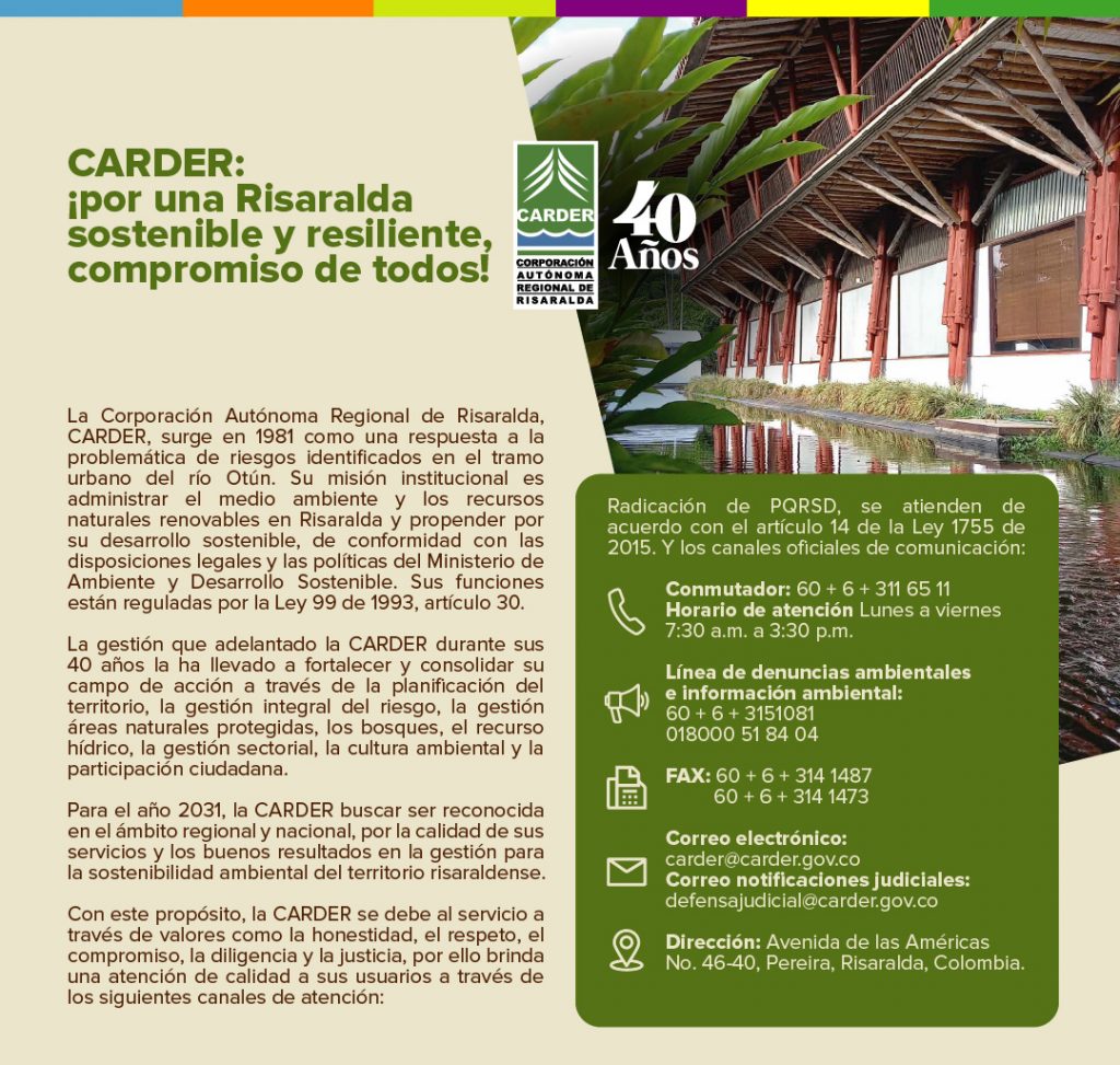 La CARDER presentará su oferta institucional de manera digital y a través de un código QR que los visitantes podrán escanear cuando se acerquen al stand para conocer así todas las acciones que adelanta la entidad. Así mismo se presentarán tres libros: uno sobre aves en las áreas protegidas de Risaralda, otro relacionado con el Plan de Ordenamiento de la Cuenca Hidrográfica del Río Otún y un último referente a Cambio Climático.