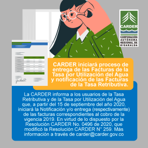 Noticias CARDER iniciará proceso de entrega de las Facturas de la Tasa por Utilización del Agua y notificación de las Facturas de la Tasa Retributiva Continuar leyendo » septiembre 15, 2020